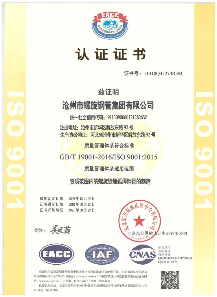沧州市螺旋钢管集团有限公司(原名为沧州市螺旋钢管(集团)有限责任公司)位于沧州市解放东路92号,是集螺旋钢管的生产加工和防腐保温为一体的企业,是河北省大型二档企业、河北省重点冶金企业。集团公司公司占地35万平方米,总资产5.8亿元,现有职工680人。其中有各类职称占10%,年生产螺旋钢管40万吨,产值18亿元。集团下属4家分公司,沧州市双龙钢管有限责任公司、沧州市泰瑞丰达国际贸易有限责任公司、沧州市欧凯管道防腐保温工程有限责任公司、沧州市螺旋钢管有限责任公司莱芜分公司。